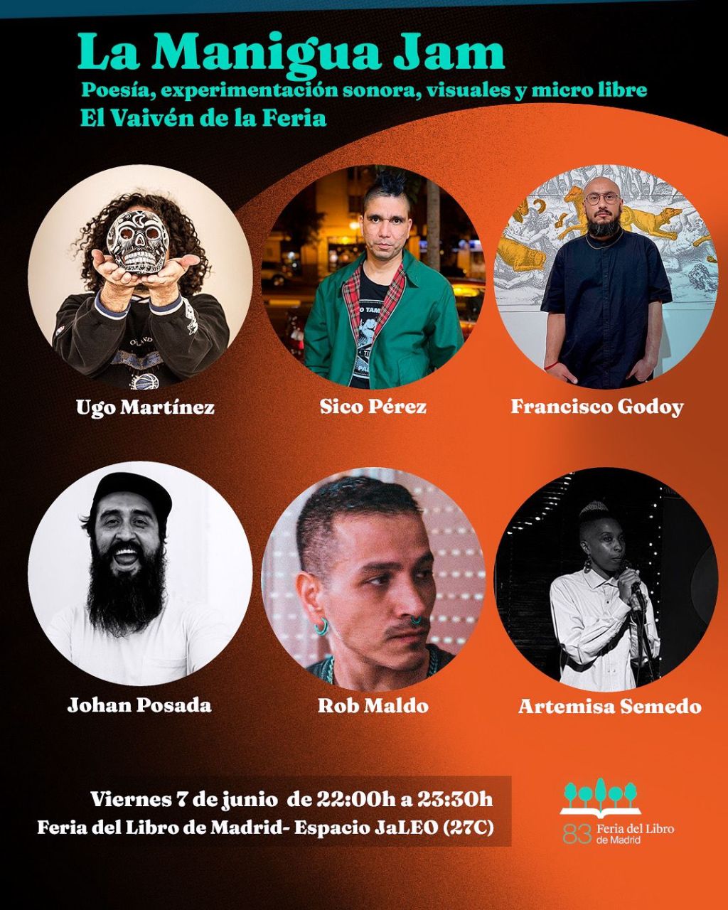 Ese será el único día que la feria abre hasta medianoche, y en La Manigua nos encontraremos Ugo Martínez como artista sonoro, Rob Maldo en las visuales y Francisco Godoy como poeta acompañadx de Sico Pérez, Johan Posada y Artemisa Semedo. Habrá micro abierto y toda la energía que siempre impregna una noche de poesía en ese espacio pantanoso y experimental.