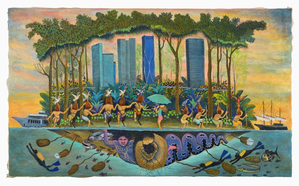 Los artistas exploran las prácticas de construcción del lugar y los reclamos de pertenencia de las poblaciones indígenas amazónicas. A través de sus obras resaltan temas de políticas espaciales, relaciones ontológicas y ecológicas, migración, cosmopolitanismo y las actuales condiciones de vida de estas poblaciones, mientras retan visiones estrechas sobre el arte contemporáneo y el lugar.