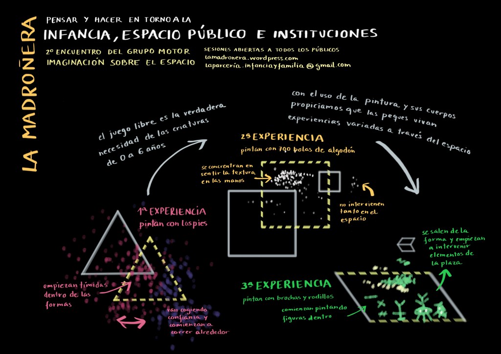 A través de distintas actividades y espacios abiertos a la participación estamos configurando un marco de trabajo con con personas activas en temas relacionados con la infancia (asociaciones, colectivos, AMPAs, etc.) y con representantes de instituciones como Medialab Prado, Juntas de Distrito de Usera y Arganzuela e Intermediae, los programas Imagina Madrid, CiudaDistrito, Mirador Usera y Mirador Arganzuela. Todas las sesiones de trabajo están abiertas a la participación de las personas interesadas. Las reuniones de este grupo motor son una vez al mes y abordan diversas cuestiones, centradas sobre todo en cómo hacer las instituciones públicas, y en concreto Matadero, más acogedoras para la infancia.