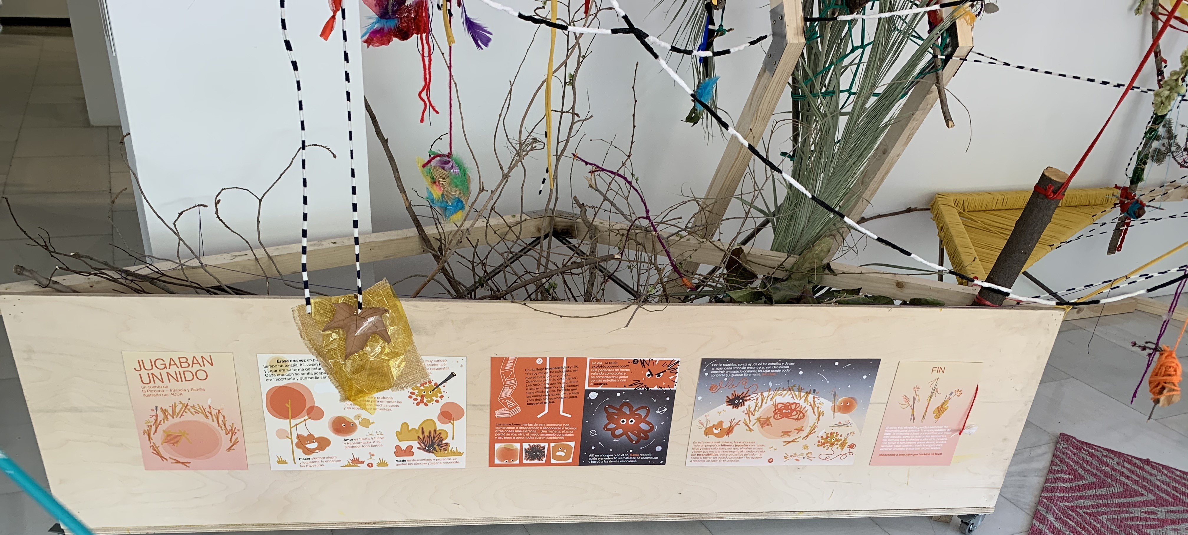 Esta instalación escultórica, pretende ser habitada y construida de manera lúdica, procesual y colectiva. Un nido a modo de lugar seguro, de recogimiento y memoria para todas las personas que transitan y son parte de la exposición NUDO NIDO. El Nido va tomando forma por medio de las manos de las participantes, las cuales tienen una guía: un cuento que invita a cambiar de altura, a mirar el mundo con los ojos de lxs niñxs y abrir un espacio – cuerpo niñx, donde acoger y elaborar heridas, miedos y temas que suelen ser tabúes o son difíciles de abordar fuera de la intimidad.