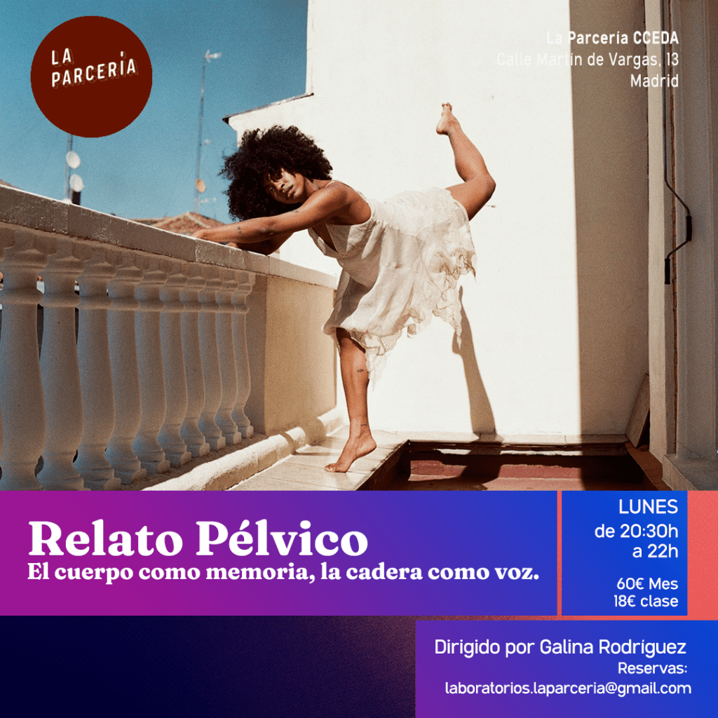 El cuerpo como memoria, la cadera como voz. Con: Galina Rodríguez. Relato Pélvico es una clase abierta a todos los niveles que invita a explorar el movimiento desde la cadera como centro de poder, placer y expresión. A través de propuestas guiadas e improvisación, nos sumergimos en la escucha del cuerpo, despertando la fluidez pélvica y el goce del movimiento. Un espacio para habitar el cuerpo, liberar tensiones y reconectar con una danza íntima, intuitiva y profundamente expresiva.
